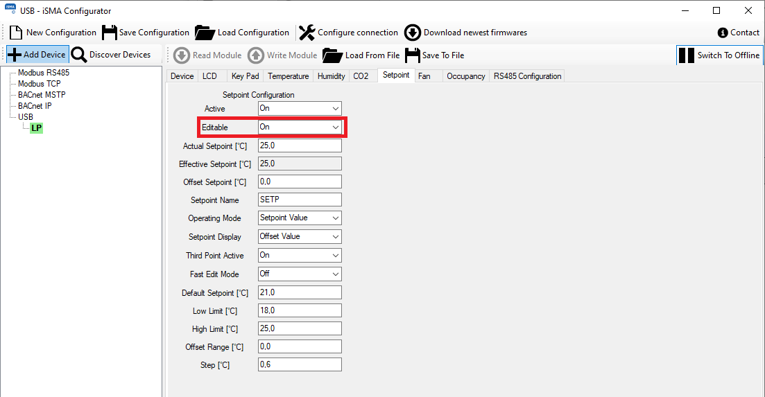 1. Connect the iSMA-B-LP panel to the PC with mini USB - USB A cable, and start the iSMA Configurator software. Click the ‘Switch to Online’ button to connect to the iSMA-B-LP and gain access to configurable options. For instance, it is possible to block editing settings from a room panel. The below print screen of the iSMA Configurator shows enabling to edit a parameter from a room panel. The Editable option is included in the Setpoint, Fan, and Occupancy sections; changing its value to off blocks the editing by the user.