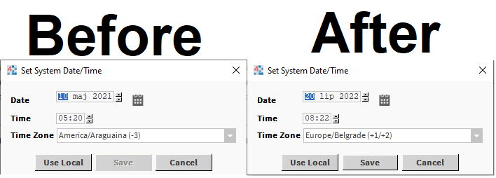 In the next step, select Change Date/Time. A pop-up will appear, select Use Local. The time will be adjusted to the one set on the PC which is connected to the controller.
