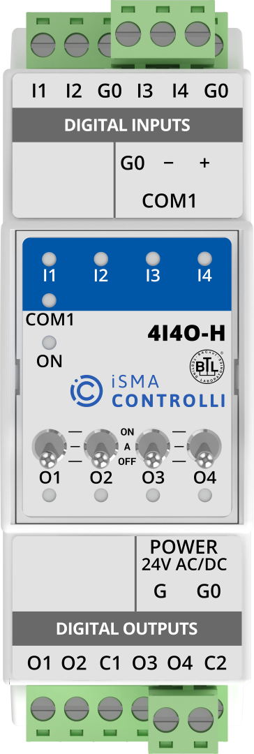 MINI series modules: iSMA-B-4U4O-H, iSMA-B-4I4O-H, iSMA-B-4O-H and iSMA-B-4TO-H, and MAX series module: iSMA-B-12O-H, both in RS and IP versions, have built-in switches for manual operation of the outputs. In the event of a communication failure, service works, etc., the user has the option of manually switching on or off the digital outputs. The module signals the manual operation mode through the output diode, eg O1, O2, etc. In case of switching on the manual mode, irrespective of the output status, the output diode lights up with a flashing light. The user has the option to check if manual mode is enabled in the BMS using both Modbus and BACnet.