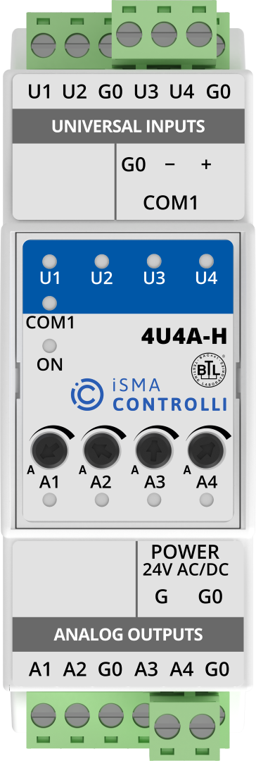 iSMA-B-4U4A-H modules, both in RS and IP versions, have built-in switches for manual operation of the outputs. In the event of a communication failure, service work, etc., the user has the option of manually activating the analog outputs. The module signals the manual operation mode through the output diode, eg A1, A2, etc. In case of switching on the manual mode, irrespective of the output status, the output diode lights up with a flashing light. The user has the option to check if manual mode is enabled in the BMS using both Modbus and BACnet.
