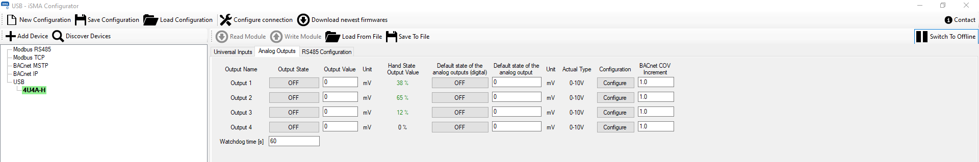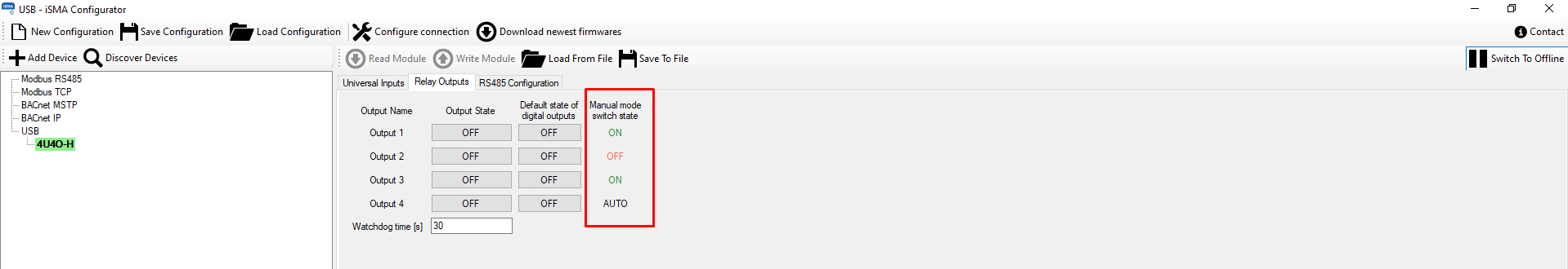 Picture 4. Status of A1, A2, A3 outputs in manual mode in iSMA Configurator.