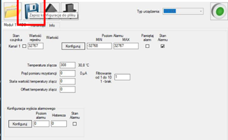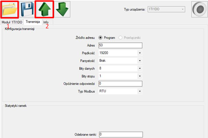 After pressing the "Update" button in the "Info" tab, the module's firmware will be updated to the latest version. After a successful update, the firmware version will change in the "Info" tab. After the update, the module's configuration must be uploaded again from the saved .xml file. To do this, select the icon "Open configuration file"(1), and then "upload configuration to device"(2).