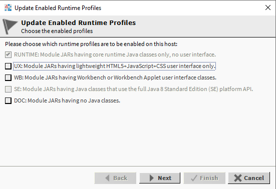 Then, to run (or stop) the profiles, in the 'Platform Administration' click the 'Configure Runtime Profiles' button, thanks to which the 'Update Enabled Runtime Profiles' wizard will be displayed in the pop-up window - here, select your profile configuration.