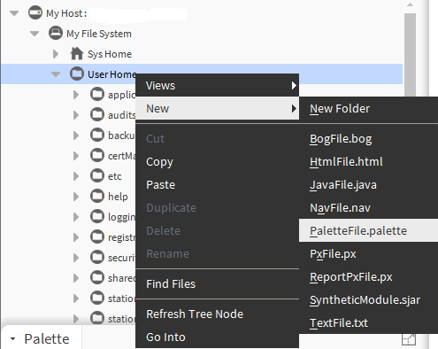 In the 'Nav' window, expand 'My Host / My File System / User Home', right-click 'User Home' and select 'New / PaletteFile.palette'. A pop-up window will appear in which you should enter the name of the palette you are creating.