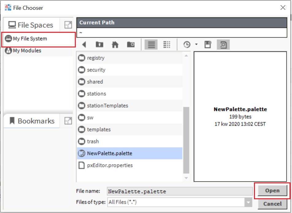 4. Another pop-up window will appear in which you should find the created palette. In this case, it will be in the 'My File System/User Home/PaletteName.palette' path, select it and confirm your choice with the 'Open' button.