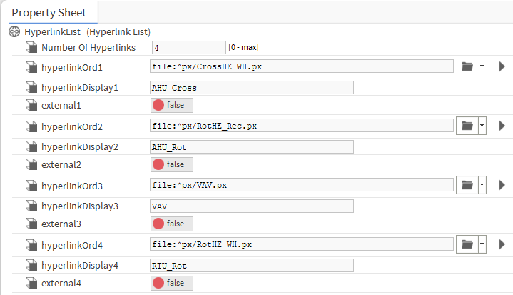 Next, after opening the AX Property Sheet view of the HyperlinkList component, set the number of hyperlinks in the drop-down menu. Next, specify the paths to the PX files that will be displayed and how they will be named inside the menu.