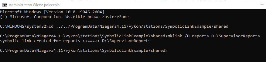 To this end, start the Windows command line as an administrator. Then use the cd command to navigate to the shared folder inside the running station. Below is a sample command for a station named SymbolicLinkExample: