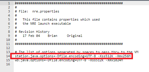 3. Next, open the nre.properties file in the Niagara Workbench. In the line containing station.java.options -Xmx256M, the number 256 should be changed to a custom value. The number next to -Xmx is the maximum memory value for the JAVA virtual machine on which the supervisor station is running.