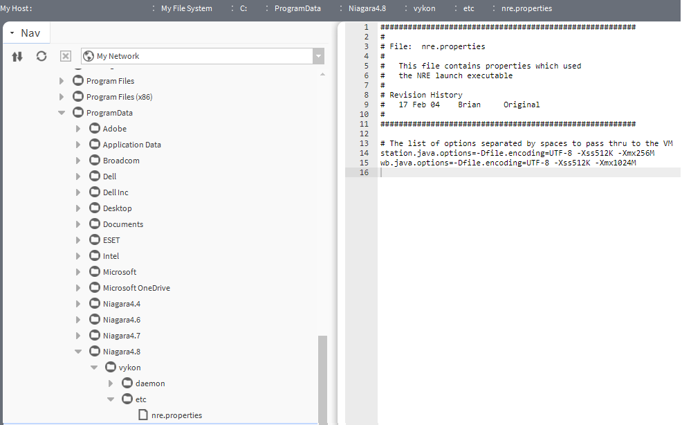 NOTE: The nre.properties file is located in several locations, but only C:\NiagaraVersion\Vykon\Etc refers to deamon, the program running in the background of the Niagara Workbench. Editing nre.properties under another location will not change anything.
