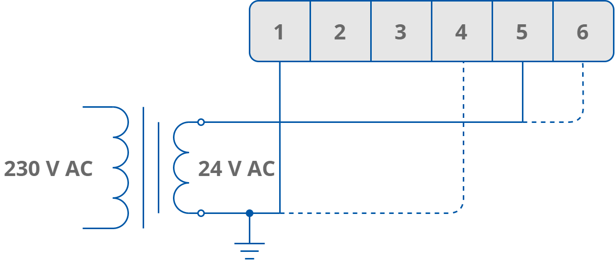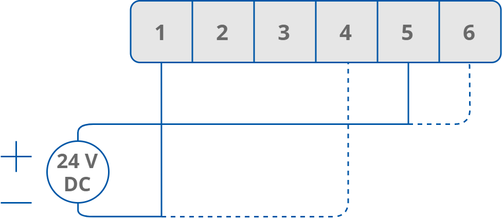 There are two pairs of pins for the 24 V AC/DC power supply connection (+24 V DC pins 5 and 6, grounding pins 1 and 4). These pin pairs can be used freely. It is especially useful if different types of connection cables are used (4 or 6 core). It is possible to use a single cable with RJ12 connectors for the power supply and RS485 communication. Pins 2 and 3 are dedicated for the RS485 communication connection.