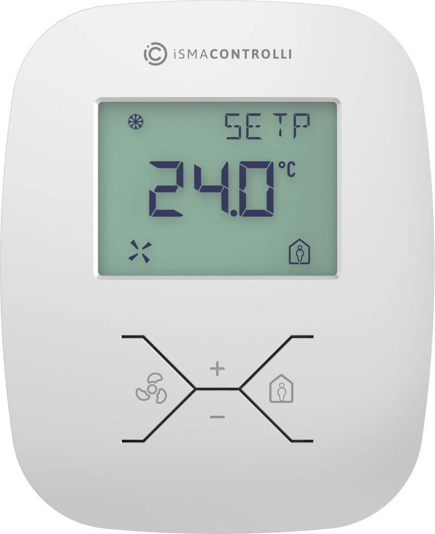 The iSMA-B-LP is a wall panel with 2.3” LCD display and four function buttons. Additionally, the panel has a built-in temperature sensor and, optionally, humidity and CO2 sensors.