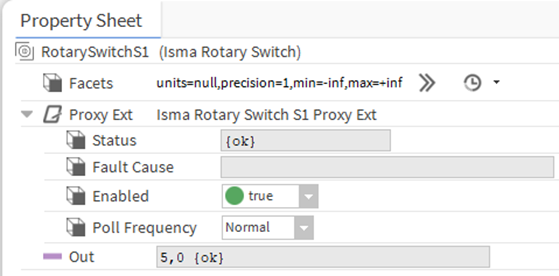 - Out: provides a real-time information about the current value set on the selected rotary switches S1/S2, in the range of 0 to 9, together with the units selected in the Facets slot and the current status of the point. If the component is working correctly, the status is considered normal and the value appears with the default status {ok}.