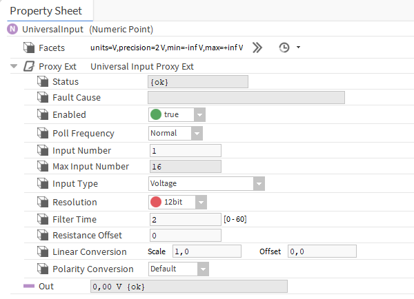 - Facets: determines how an input value is displayed on available views in the station with its unit and decimal point accuracy. By default, a value of the Facets slot depends on a type of the input selected in the ProxyExt/Input Type slots. If the resistive input type is set, the Facets slot will be set to Ohm and a number of decimal places to 0;
