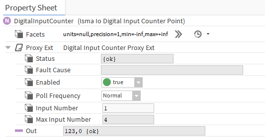 - Out: provides a real-time information about the current value of the input data, together with the units selected in the Facets slot and the current state of the point. If the value of the Out slot is forced by one of the available component actions, the value is followed by an information about the executed action, e.g., {overridden}. If the component is working correctly, the status is considered normal and the value appears with the default status {ok}.