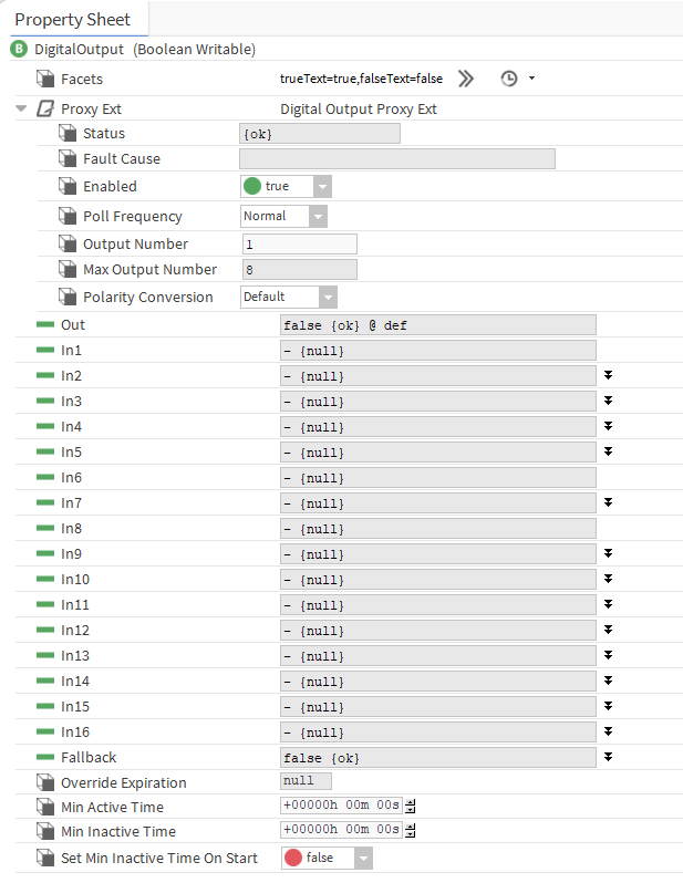 - Out: provides a real-time information about the current value of the input data, according to parameters set in the Facets slot, Polarity Conversion slot, and current state of the point. If the Out slot value was forced by one of the available component’s actions, the value is followed by information about the executed action, e.g., {overridden}. If the component is working properly, the status is considered normal, and the value appears with the default status {ok}.