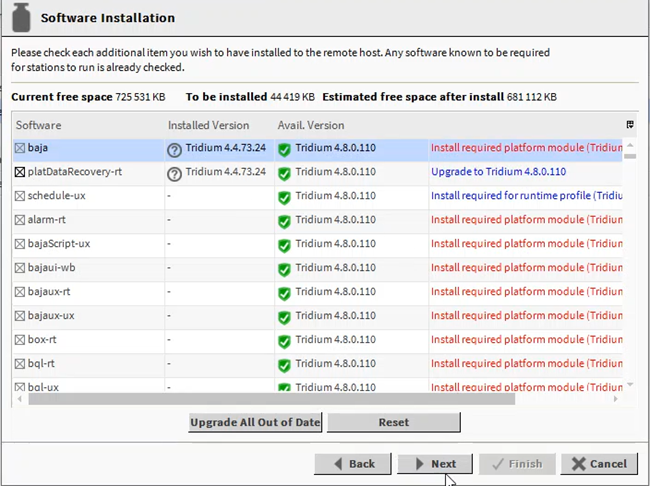 The installer will automatically copy all files to the appropriate disk space with Niagara installations. The next step is to run the required version of the Workplace, connect to the platform of the driver to be updated, and perform the command Commissioning Wizard. When performing the Commissioning Wizard, select the Upgrade All Out of Date option for all modules used, as shown below: