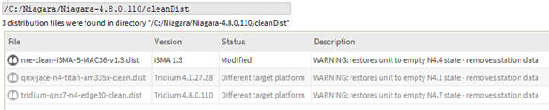 Note: Installing a clean dist wipes the entire file system, and installs an appropriate version of Niagara platform daemon, resetting the unit to a near factory state. All other data is deleted from the file system, including station bog files, Px files, modules, etc. The unit’s TLS private key information is also deleted. In addition, installing a clean dist deletes all configured platform users, restoring the factory-default platform credentials and port (3011). Only TCP/IP settings, license file, and secure communication configuration (TLS) will be preserved.