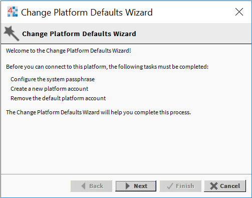 If the Change Platform Defaults Wizard displays, click Next to step through creating a system passphrase, creating a new platform account, and removing the default platform account, as shown below.