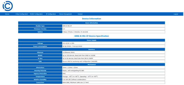 The iSMA-B-MG-IP device has a built-in web server, which allows to show device status and to change configuration.