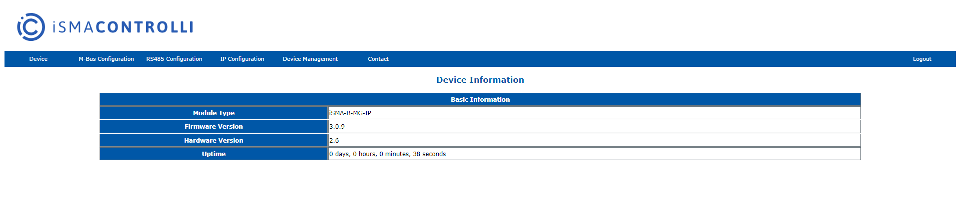 The iSMA-B-MG-IP device has a built-in web server, which allows to show device status and to change configuration.