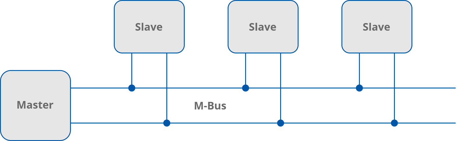 The M-Bus is a hierarchical system, with communication controlled by a master device (for example, the AAC20-M). The M-Bus consists of a master, a number of slaves (end-equipment meters) and a two-wire connecting cable. The slaves are connected in parallel to the transmission medium–the connecting cable.