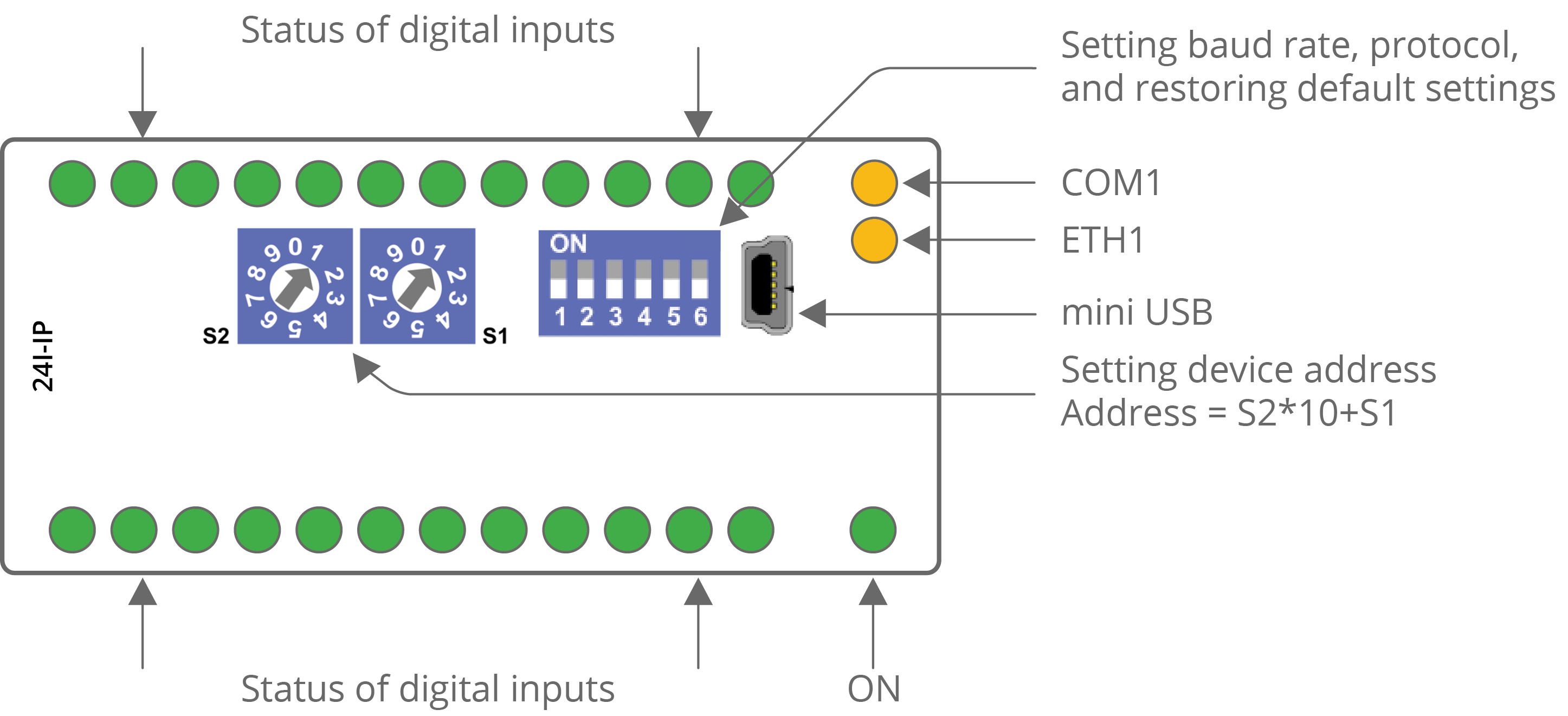 - LEDs indicating the status of the digital inputs (I1-In) are lit when the input is active.