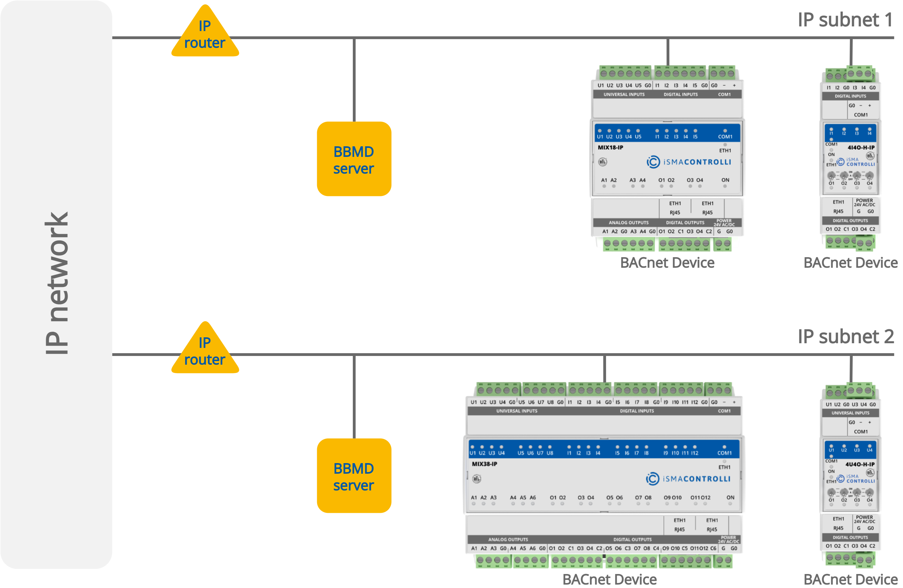The BACnet/IP Broadcast Management Device (BBMD) is a device added to the BACnet network, which broadcasts messages discovering devices on the network. The BBMD solution allows to overcome an issue of standard IP routers, which cannot forward BACnet messages for BACnet networks on multiple IP subnets (two or more). In such networks, each IP subnet, which is a part of a BACnet IP network with two or more subnets, needs a BBMD Server in order to communicate. If the BBMD Server has also been designated to register foreign devices like iSMA I/O IP modules, it shall include a Foreign Device Table (FDT).