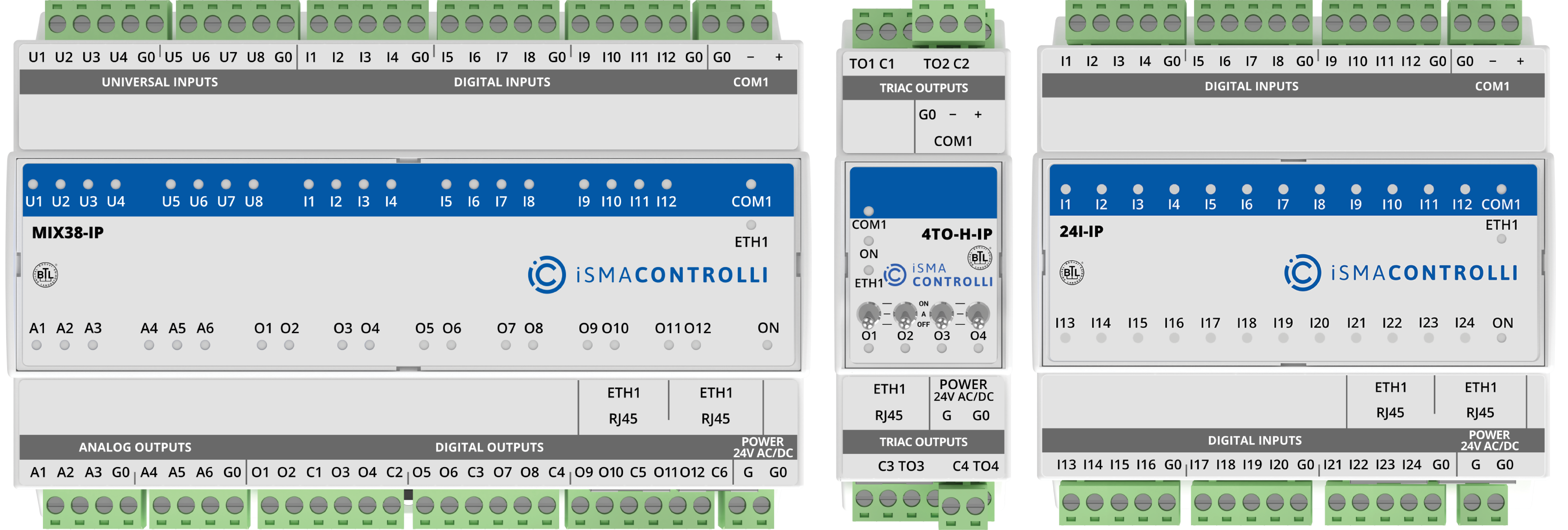 The MINI, MIX, and MAX series of multiprotocol I/O modules with RS485 and IP have been designed for building distributed control systems using MAC36, AAC20, or another controller. Each module is equipped with the most commonly used types of I/Os in building automation. Depending on the version, the modules are equipped with a mix of different types of I/O in one unit: