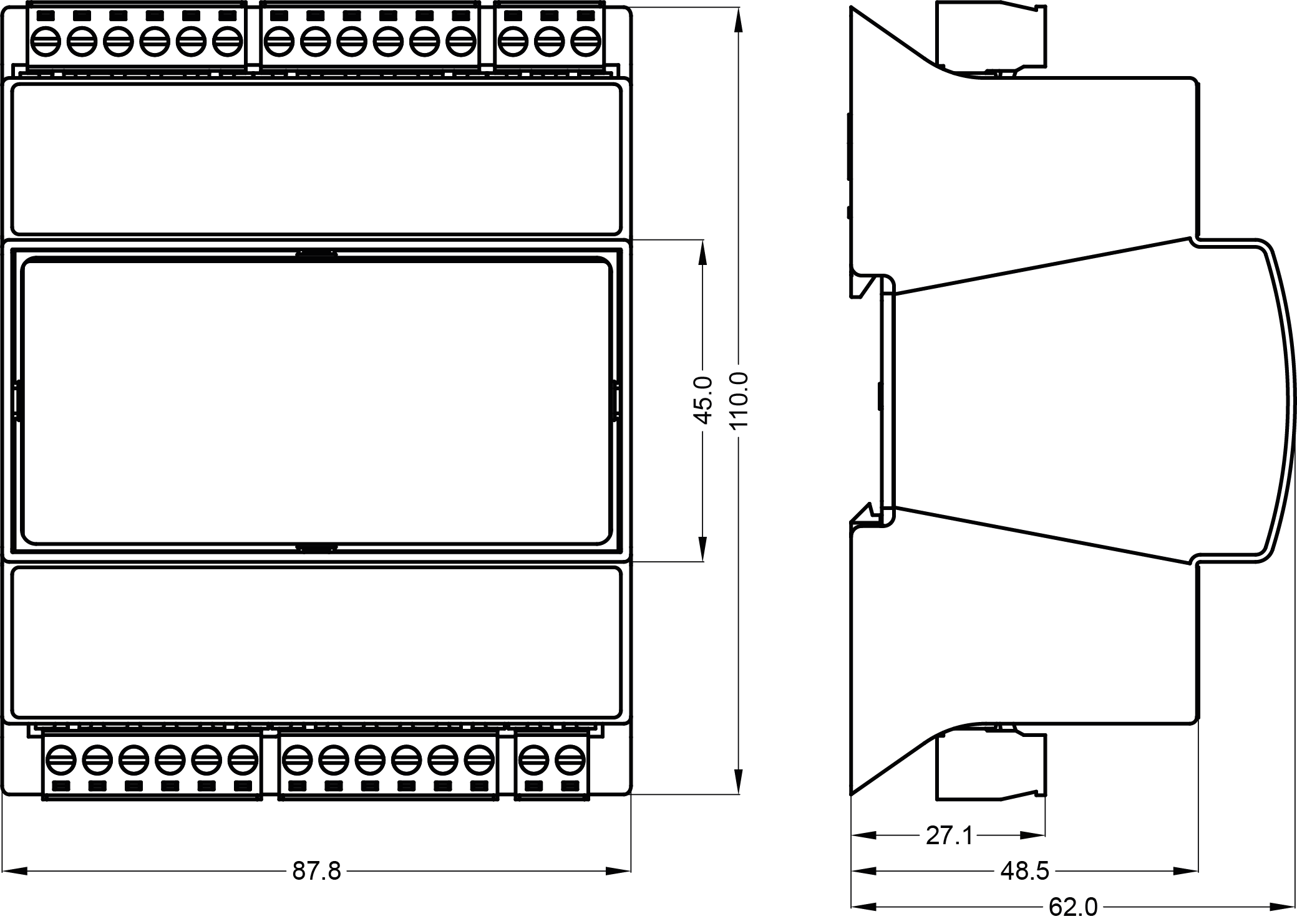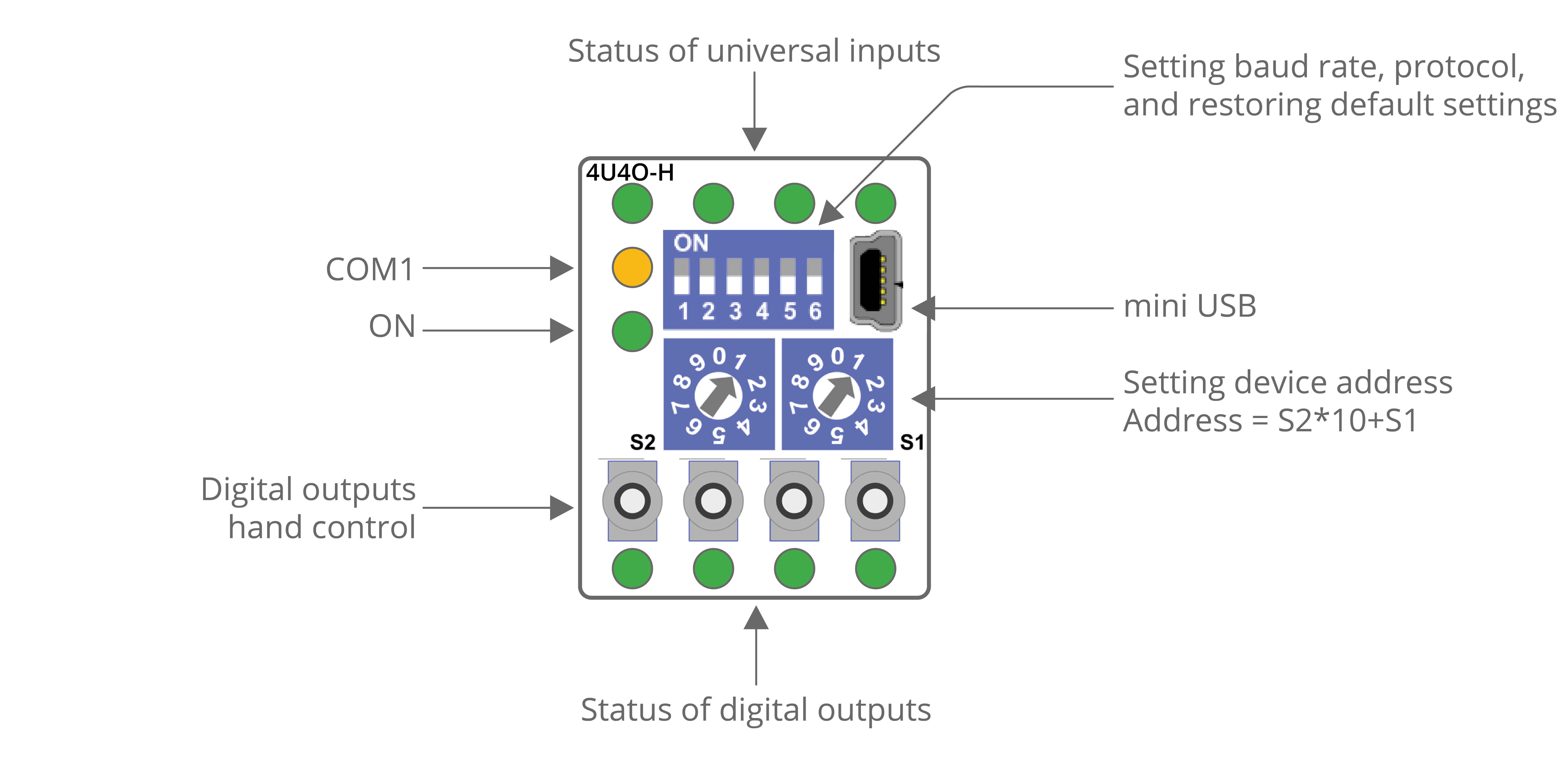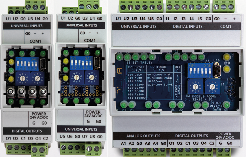 LEDs indicating the status of the universal inputs (U1-Un) are lit when the resistance connected to the input is less than 5 kΩ (dry contact input is active).