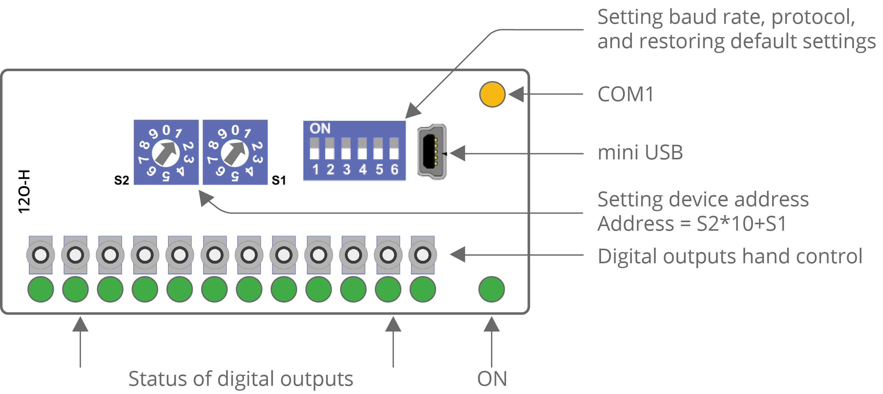LEDs indicating the status of the triac outputs (TO1-TOn) are lit when the output is enabled or PWM duty cycle is greater then 0.