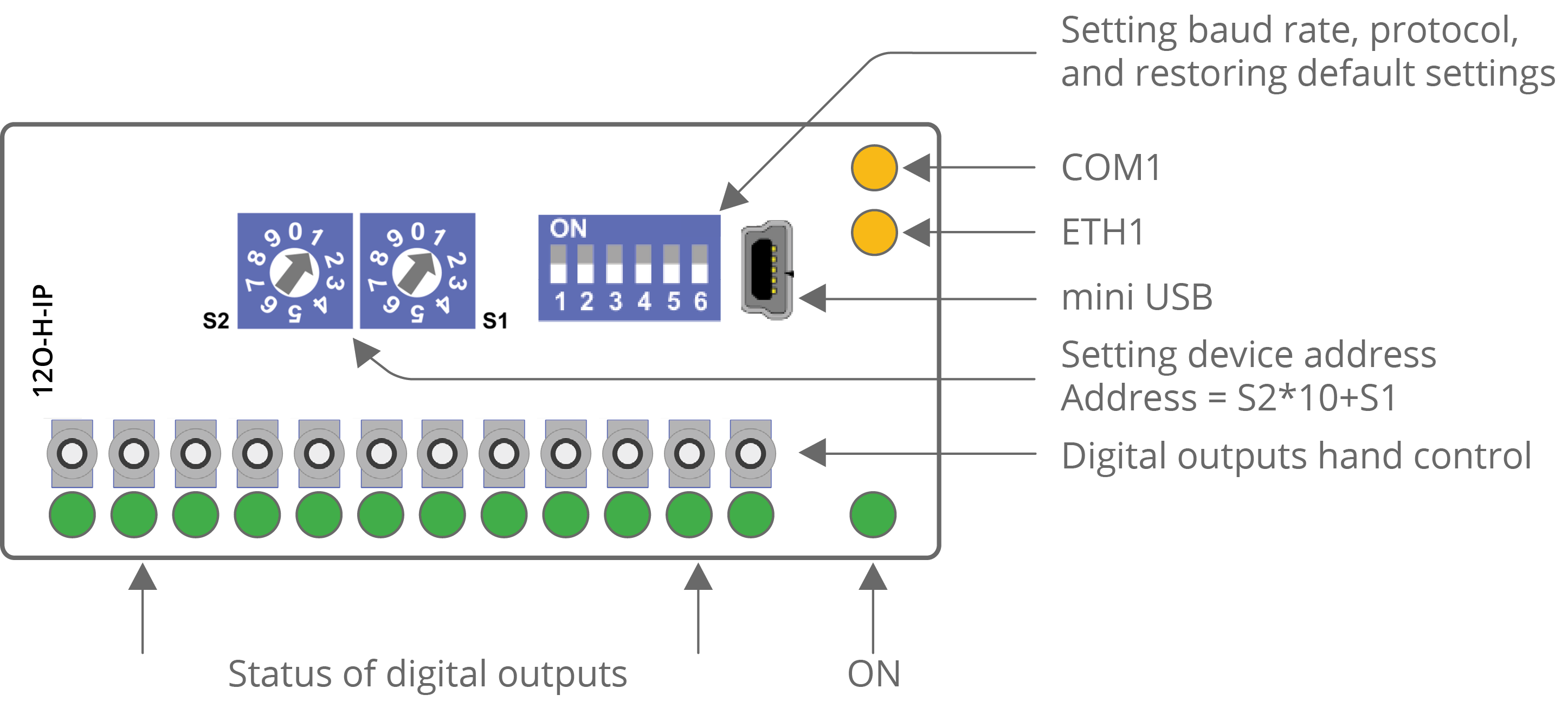 LEDs indicating the status of the digital outputs (O1-On) are lit when the output is enabled.