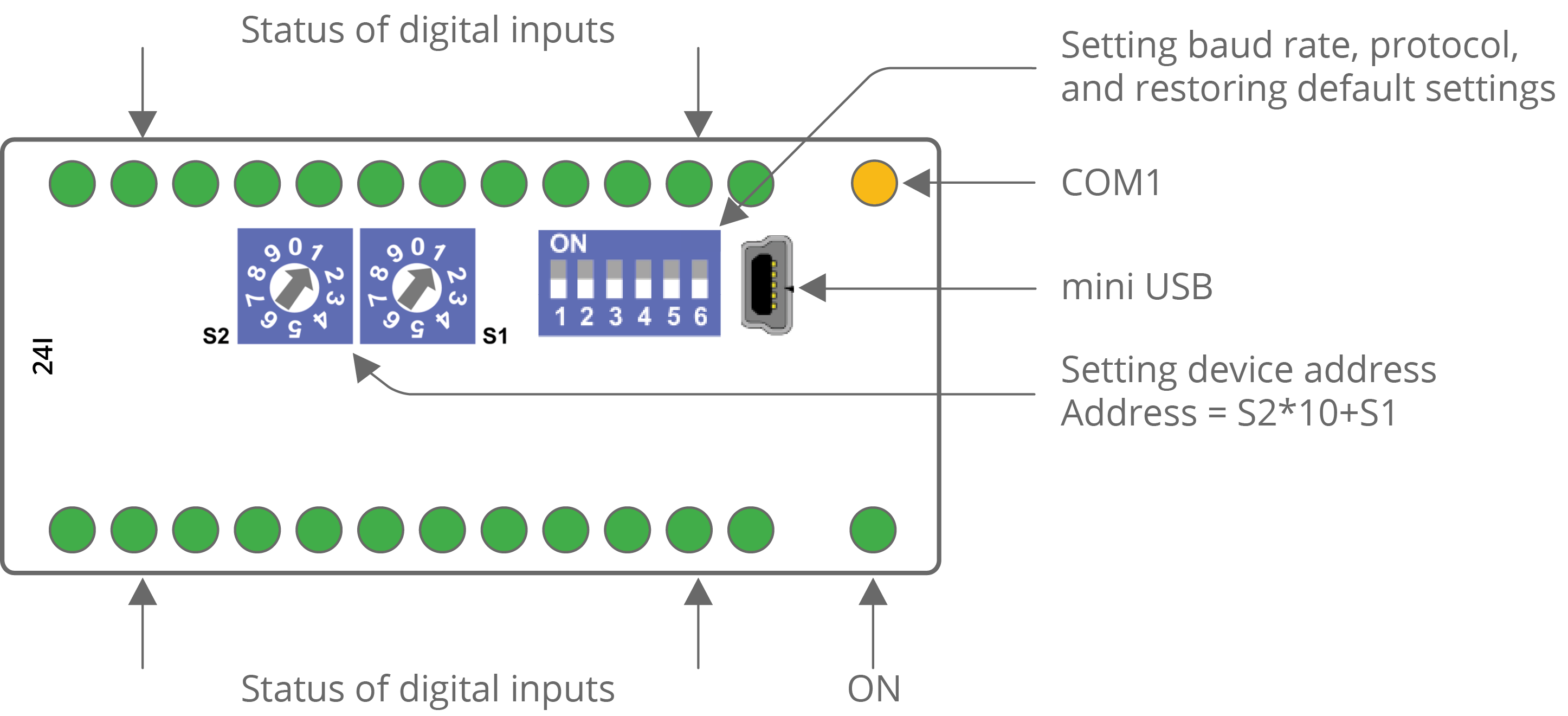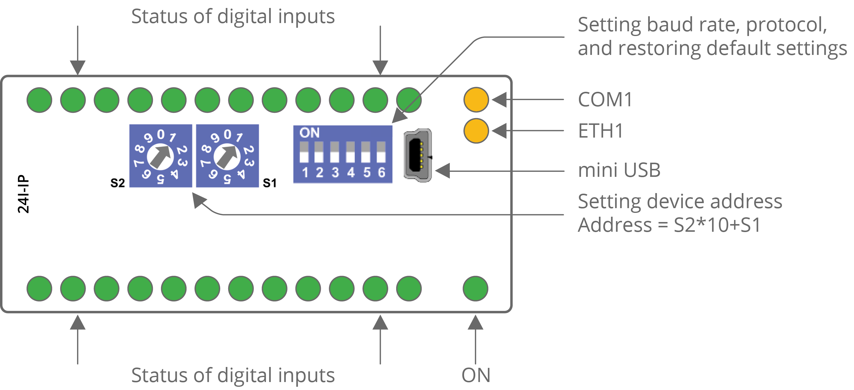 LEDs indicating the status of the digital inputs (I1-In) are lit when the input is active.