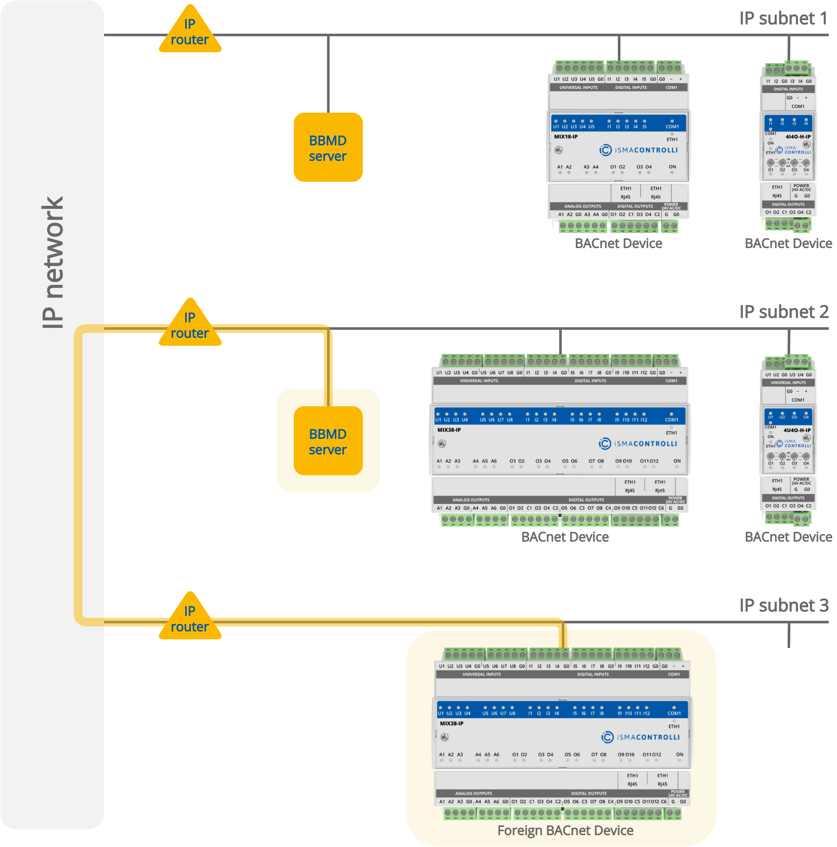 The BACnet/IP Broadcast Management Device (BBMD) is a device added to the BACnet network, which broadcasts messages discovering devices on the network. The BBMD solution allows to overcome an issue of standard IP routers, which cannot forward BACnet messages for BACnet networks on multiple IP subnets (two or more). In such networks, each IP subnet, which is a part of a BACnet IP network with two or more subnets, needs a BBMD Server in order to communicate. If the BBMD Server has also been designated to register foreign devices like iSMA I/O IP modules, it shall include a Foreign Device Table (FDT).