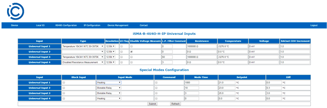 This page allows for entering the configuration parameters and showing the actual value of Special application modes. To open this page, please navigate to the Local I/O tab and choose Universal Inputs from the submenu.