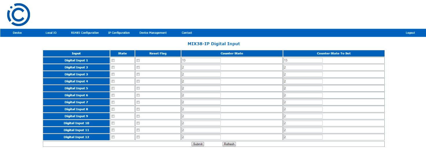 This page allows for entering the configuration parameters and showing the actual value of the digital inputs. To open this page, please navigate to the Local IO tab and choose Digital Inputs from the submenu.