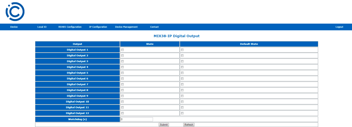 This page allows for entering the configuration parameters and showing the actual value of the digital outputs. To open this page, please navigate to the Local I/O tab and choose the Digital Outputs from the submenu.