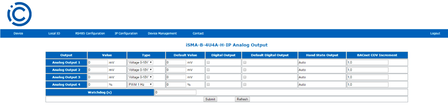 This page allows for entering the configuration parameters and showing the actual value of the analog outputs. To open this page, please navigate to the Local I/O tab and choose the Analog Outputs from the submenu.
