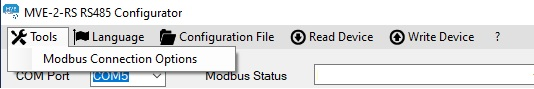 As indicated in the previous section, the Modbus configuration parameters of the master can be selected through the dropdown menu: Tools → Modbus Connection Options. The changes of the Modbus connection parameters of the master must be done prior to clicking the connect toggle button.
