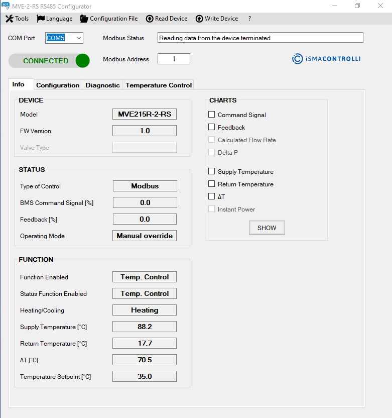 WARNING! The CHARTS functionality is NOT available in the MVE-2-RS USB Configurator.