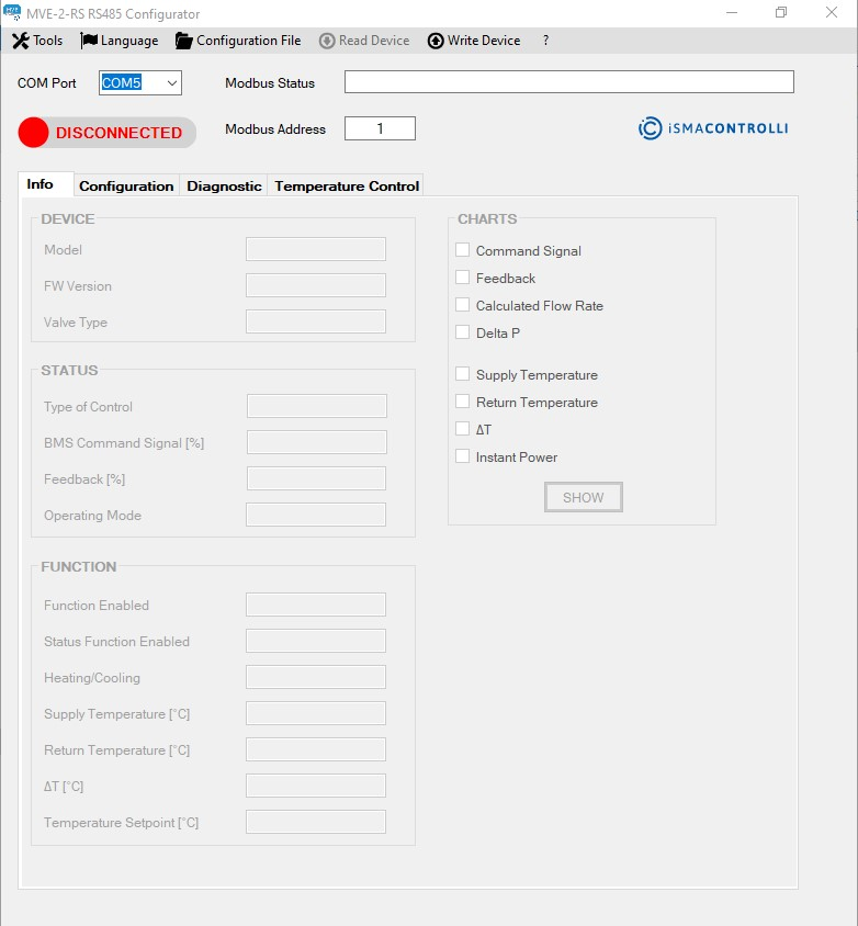 To enable the tabs, it is necessary to select the COM connected to the USB-RS485 converter and click the toggle button with the DISCONNECTED label. If the connection is successful, all tabs will be enabled. To list all COM ports available, click the COM port label.