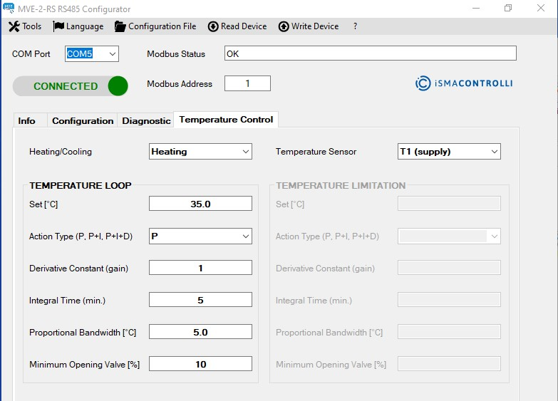 - Temperature Minimum Limitation: the actuator is controlled by the input signal (voltage or current control) or by the Modbus command but, if the temperature goes below the temperature limitation set (heating or cooling), the actuator: