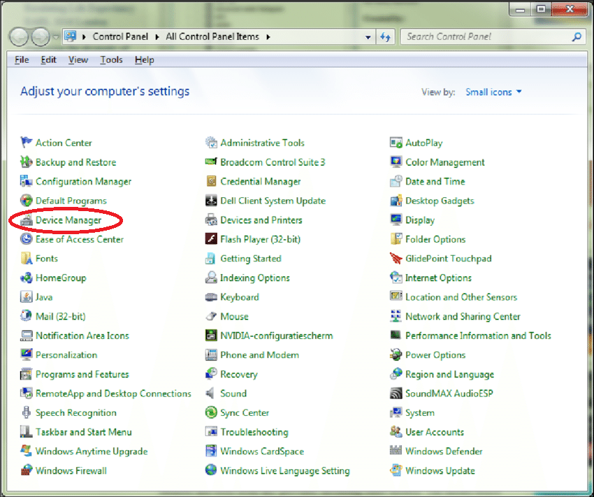In the upper area of the main window, there is a dropdown list that displays the COM port currently in use by the PC. To identify the number of the serial port (COM Port), which the USB-RS485 converter is connected to, it is necessary to access the PC Control Panel and select the Device Manager:
