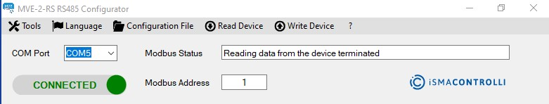 Tools: allows to define the Modbus connection options related to the iSMA-B-CVT-RS485 converter. If the user intends to change the Modbus connection options, the parameters have to be changed before clicking the toggle button to connect to the Modbus configuration tool: