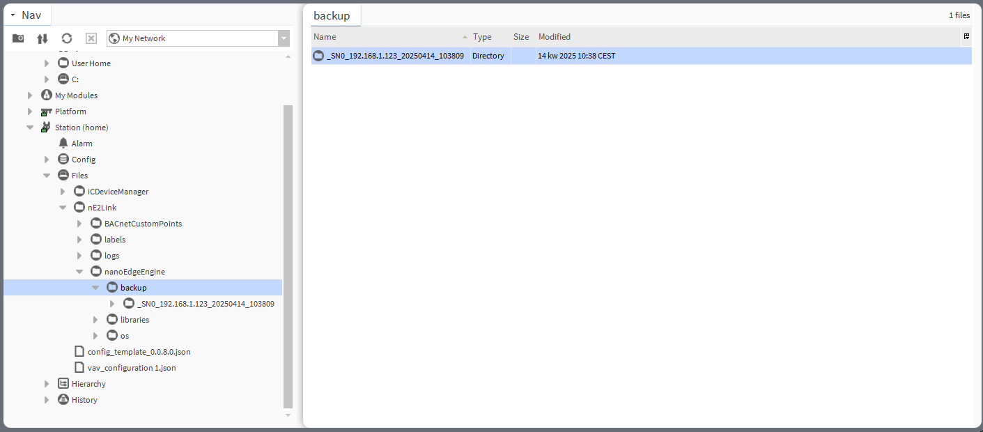 All local backups are stored in the local Niagara station. To access backups go to Station → Files → nE2Link→ nanoEdgeEngine ->backup → BackupName. Backups can be imported or exported from this location manually and will become visible in the Backup Manager view.