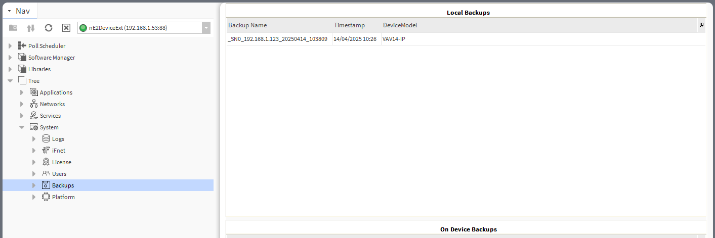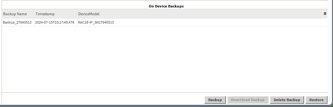 To perform a backup, go to the Backup Manager of the device, in the Backups component in the System container. The backup can be restored to the device.