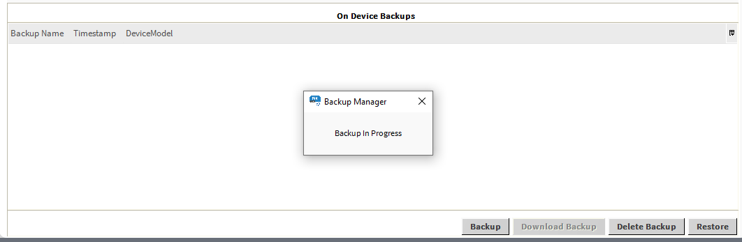 Once the process is completed, the backup will be visible in the On Device Backups table in the Backup Manager view.