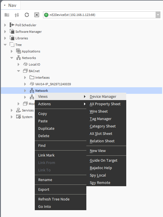 The BACnet Device Manager view is accessible from the context menu of the BACnet Network component. It is also automatically opened if the BACnet Network component is double-clicked in the nav tree window.