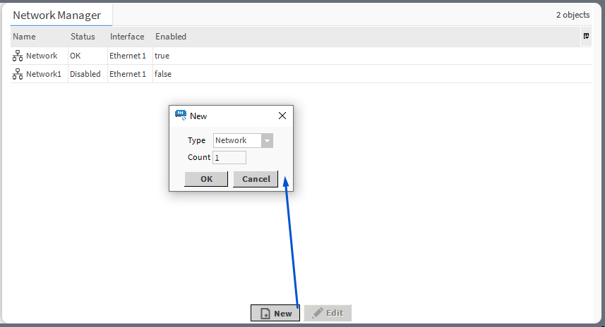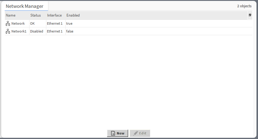 The Network Manager view is available for the BACnet component. It lists all BACnet networks configured on the device's ports. The Network Manager view shows the statuses, ports (which the network is configured on), and enabled or disabled states of the network.