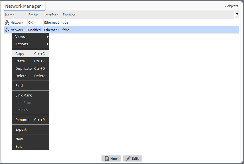 The BACnet Network Manager view is accessible from the context menu of the BACnet component. It is also automatically opened if the BACnet component is double-clicked in the nav tree window.
