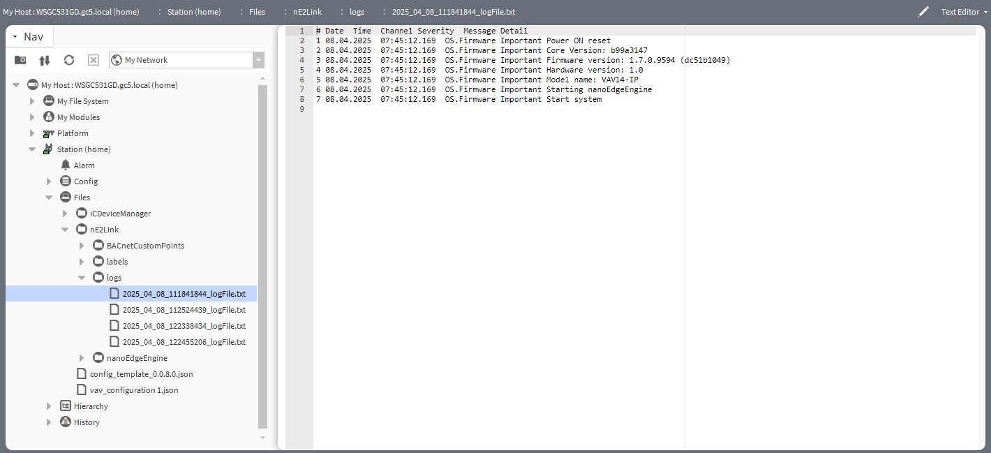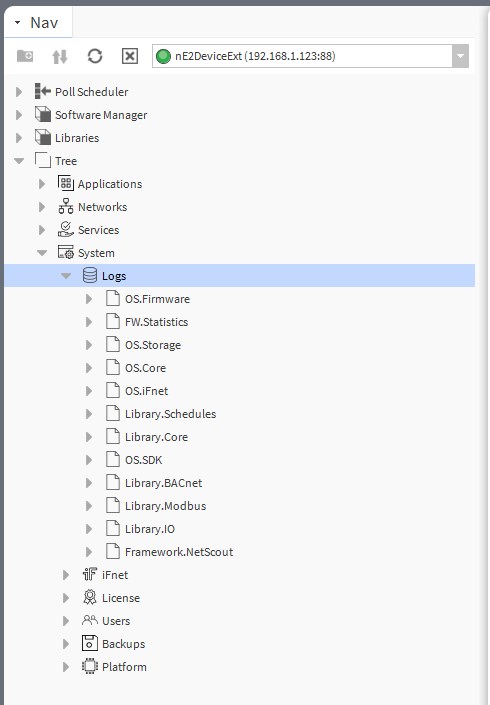 Important: logs containing information crucial for device identification (e.g., iFnet IP address and port, firmware version, hardware version, core version), device readiness (e.g., system started, loaded services, BACnet/Modbus ports, loaded libraries, etc.), and important actions (e.g., detected DIP switch reset, factory reset, successful restore, etc.),